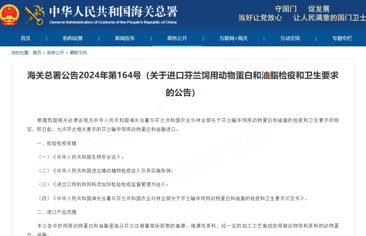 咨询:海关总署公告2024年第164号(关于进口芬兰饲用动