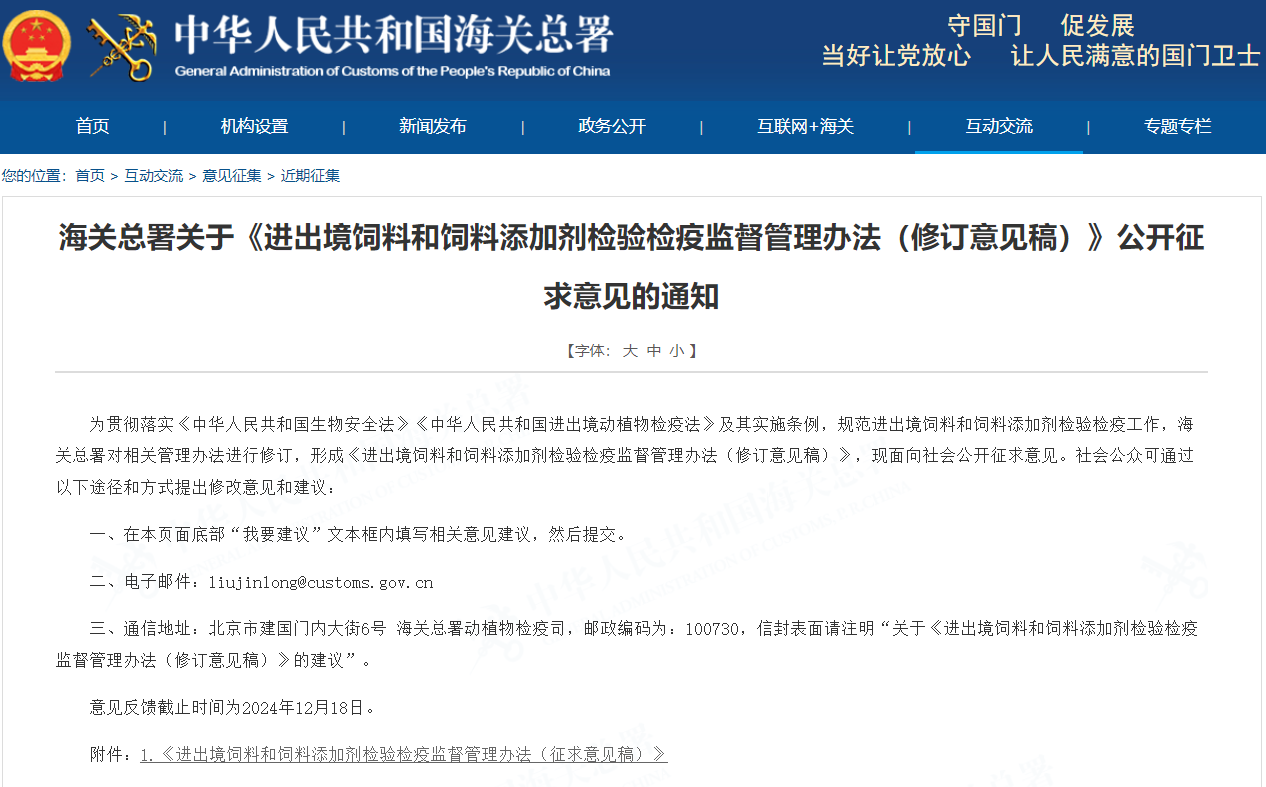 贯彻落实《中华人民共和国生物安全法》《中华人民共和国进出境动植物检疫法》及其实施条例,规范进出境饲料和饲料添加剂检验检疫工作,对相关管理办法进行修订,形成《进出境饲料和饲料添加剂检验检疫监督管理办法(修订意见稿)》,现面向社会公开征求意见。社会公众可通过以下途径和方式提出修改意见和建议: